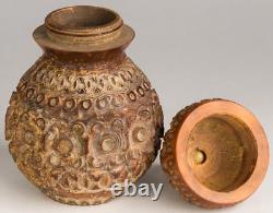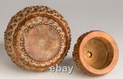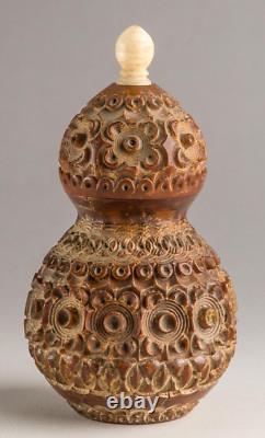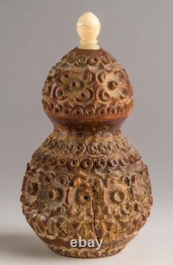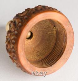 ANCIENT TOBACCO BOX, CARVED SNUFFBOX IN COROZO IN TWO PARTS: UPPER PART WITH THREAD, SCREW THREAD IN GOOD WORKING CONDITION. ANCIENT WORK OF A CONVICT... GOOD CONDITION OF ANTIQUITY, NO MISSING PARTS INCLUDING ON THE UPPER PART, NOTE A "SURFACE CRACK" ON ONE SIDE. DIAMETERS: BASE 2.4cm, OPENING 1.9cm, UPPER PART 2.8cm.
