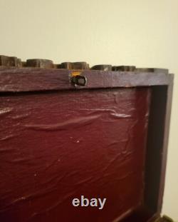 Dimensions: 29 X 22.5 cm. One handle is missing from the lid, no key, wear and tear. All items from MaBrocanteWeb are vintage and second-hand, and may therefore show signs of wear and age that add to their charm. We will strive to describe any imperfections as accurately as possible.