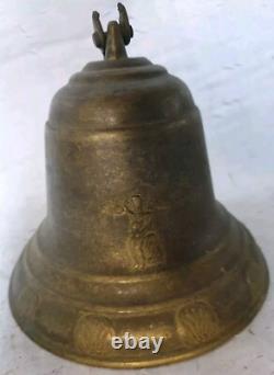 There are several engraved motifs all around the bell, two angels (most likely Gabriel and Michael) and various fleur-de-lis. Very nice patina (in its original condition) and in very good shape. Dimensions: height of the bell 14.5 cm, diameter: 14.5 cm.