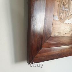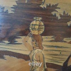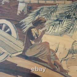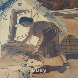 This painting is made of wood and crafted from different wood species, representing a village landscape through its marquetry. We see village women and men at work surrounded by animals like cows, chickens, and roosters. They are on a beach. The scenery is very exotic, reminiscent of India or neighboring countries.