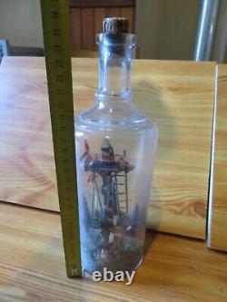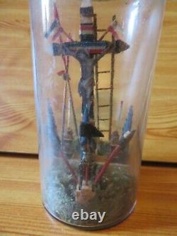 Very beautiful old bottle of the Passion / Calvary in a bottle containing the representation of Jesus Christ on the Cross with the tools of the Passion, made of natural moss. Glass bottle measuring 26 cm (without the cork). Superb collectible item, RARE because it was made by a soldier from the trenches who had been hospitalized.