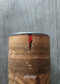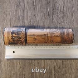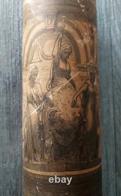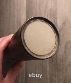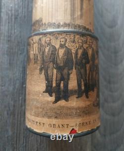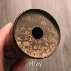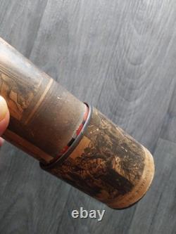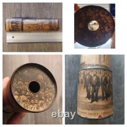 Length: 22.5 cm, diameter: 6 cm. In good condition (as found). The optical system is worn but works by slowly turning the tube while looking through the eyepiece; it alternates decorative and symmetrical patterns made of small colored beads that move in their compartments. Historical context of this object: 1876 Philadelphia World’s Fair.