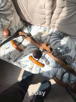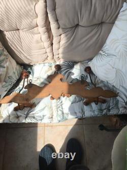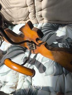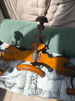 The lower hooks measure 13 centimeters, and the upper hooks, made of turned wood, have a diameter of 5 centimeters. The thickness of the wood at the front is 1.7 centimeters.